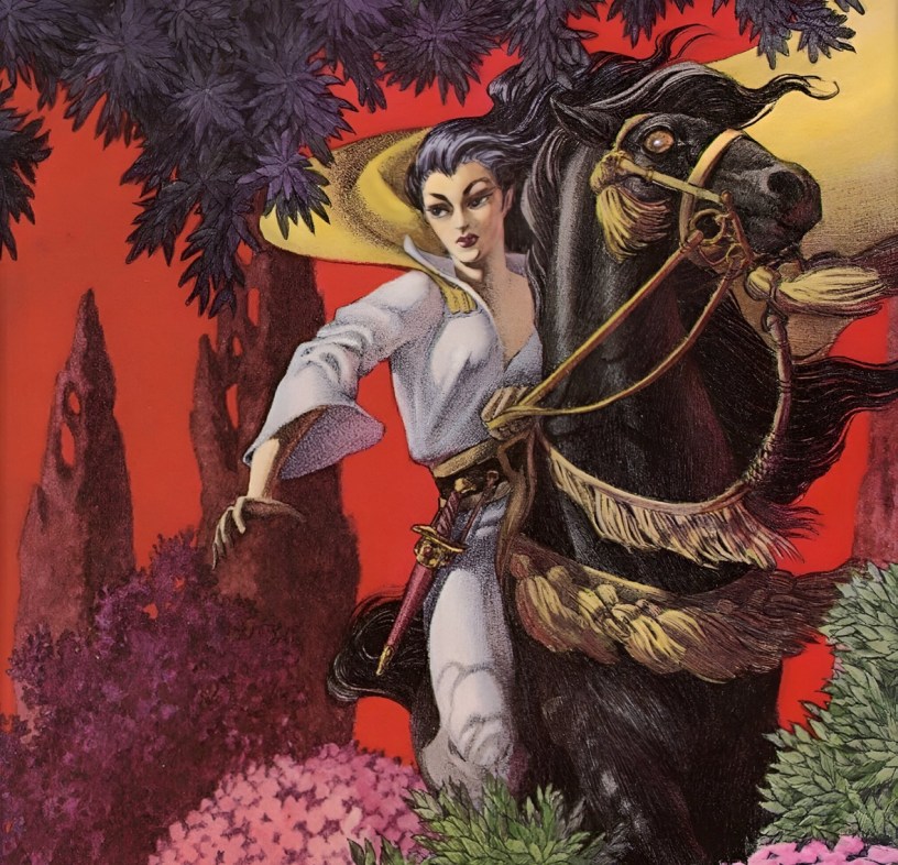 At the nearby port of Saskervoy, Cugel takes employment as a “worminger” aboard the ship Galante, a position that involves the unpleasant task of maintaining the giant marine worms that propel the vessel. When he learns he’s to be replaced and stranded, Cugel hijacks the ship, kidnapping the owner’s wife and three daughters. This leads to one of the novel’s most amusing sequences, as Madame Soldinck, whom Cugel naively entrusts with night navigation duties, secretly turns the ship in the opposite direction each night while Cugel is distracted by her daughters.
