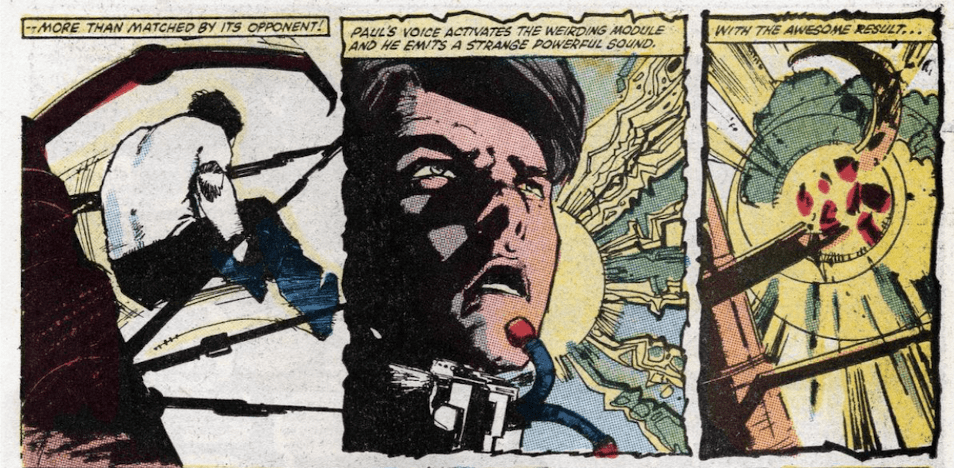 The personal shields are rendered with practical precision, mirroring the force fields we usually see in comics – crackly and filled with malevolent energy. The panels where Paul battles his trainer and esoteric training ‘dummy’ build rhythmically to the moment of the final strike. This makes the complex mechanics of the scene instantly understandable while maintaining its visceral impact.
