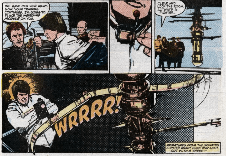 Let me highlight one particular sequence that demonstrates how Sienkiewicz transformed Lynch’s vision: the Paul being trained by Gurney Halleck scene. In the film, this scene is tense but somewhat confusing for viewers unfamiliar with Herbert’s weird and blocky force-field technology. In Sienkiewicz’s hands, the scene becomes a masterclass in visual storytelling.