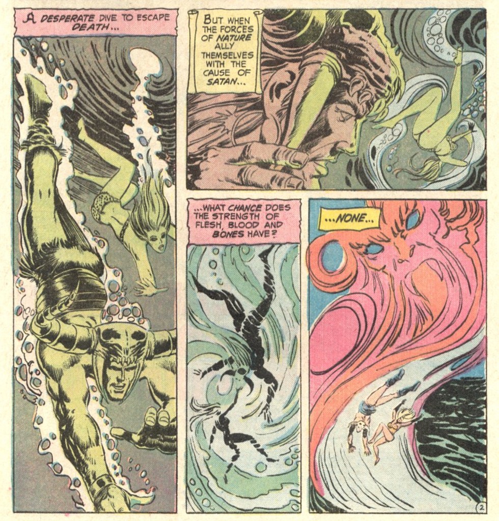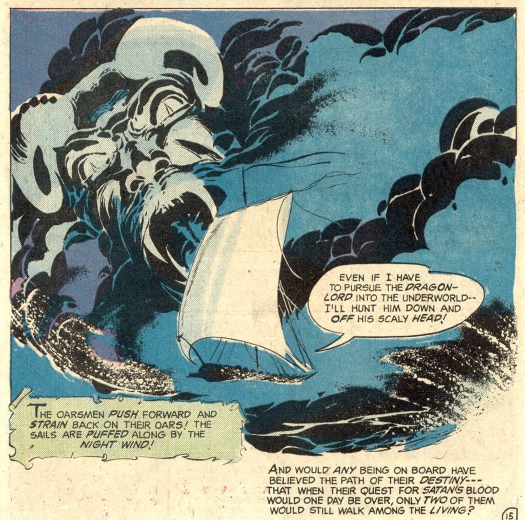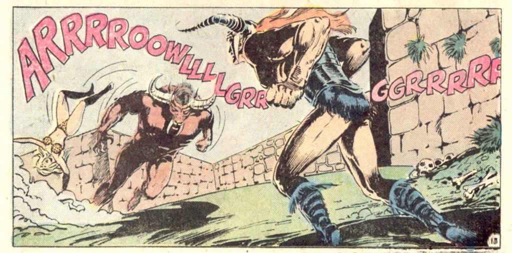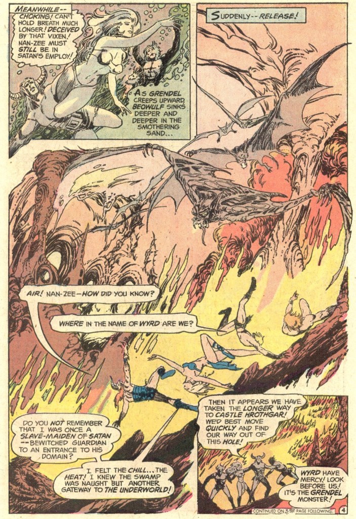 Almost immediately, Beowulf is detoured into the Underworld and has to rescue a captive warrior named Nan-Zee from demons under the control of none other than Satan himself. Yes. The Devil. First issue. Nan-Zee, by the way, is a tough, capable fighter who becomes Beowulf’s main companion (and romantic interest) throughout the series, very much in the mold of the strong female characters appearing in S&S comics of the time.