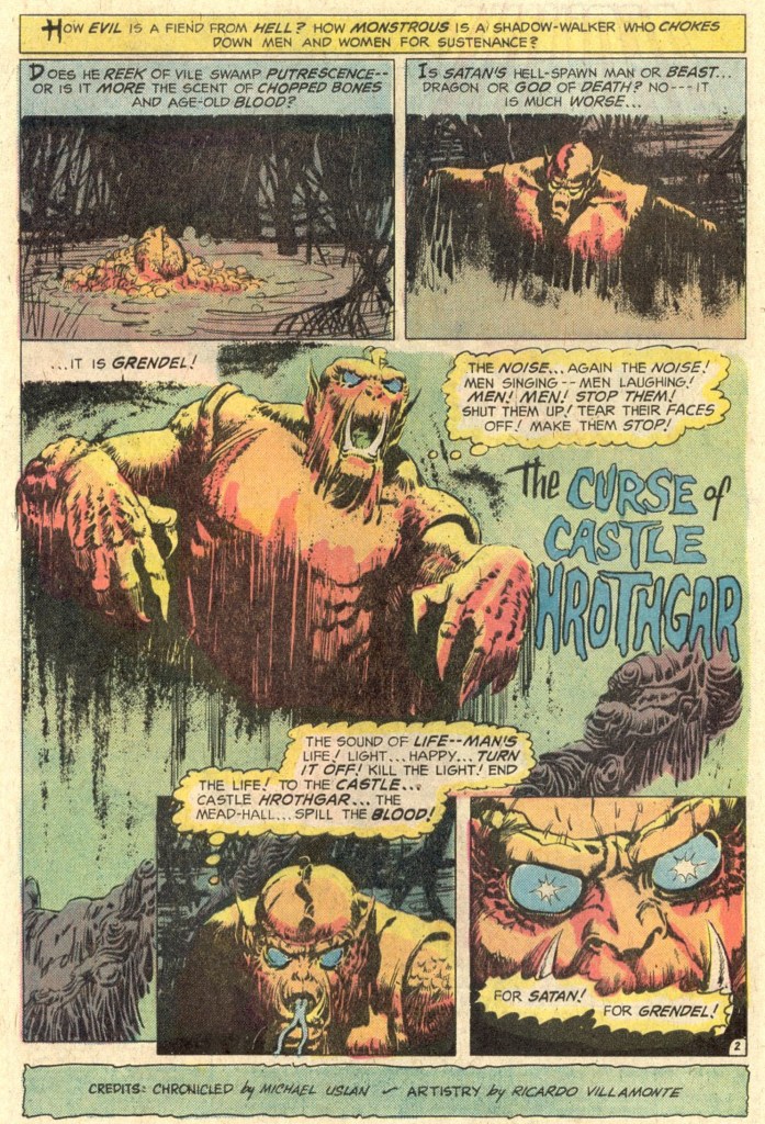 They launched several titles in this vein: Warlord (which became a huge hit), Tor (by the great Joe Kubert), Claw the Unconquered, Stalker, and an adaptation of Fritz Leiber’s Fafhrd and the Gray Mouser in Sword of Sorcery. Beowulf: Dragon Slayer was part of this push. The idea was to take “English Literature’s first and greatest hero” and give him the barbarian comic treatment.