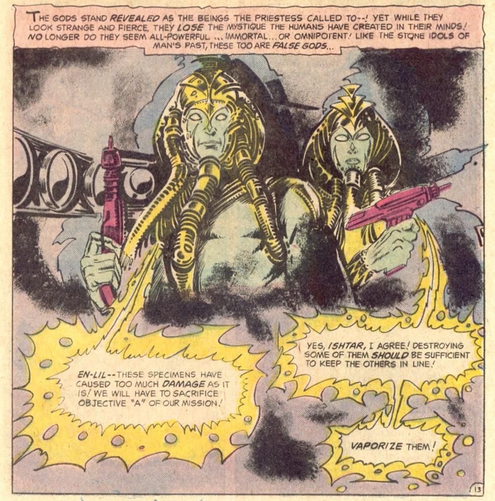 But while Conan largely stayed within the bounds of Robert E. Howard’s Hyborian Age pulp fantasy, and Warlord built its own consistent fantasy world, Beowulf went… everywhere. It was as if writer Michael Uslan and artist Ricardo Villamonte were given the keys to the mythological and sci-fi toy chests and told to just empty them out onto the page.
