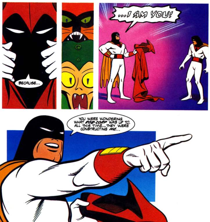 Fear not, Weirdos, lest you think I’ve lost my space marbles – this evil Space Ghost was in fact an android duplicate created by Rob-Corp using that DNA scan from earlier in the story.