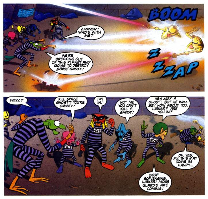 Ou tale opens on Gaolworld, this desolate asteroid prison floating in the void of space. Four of Space Ghost’s most dangerous enemies are locked up there—Zorak (that mantis-like menace), the Creature King, Brak, and Lurker. Zorak’s ranting about destroying Space Ghost when he gets zapped by a robot sentry for stepping out of line during their prison march.